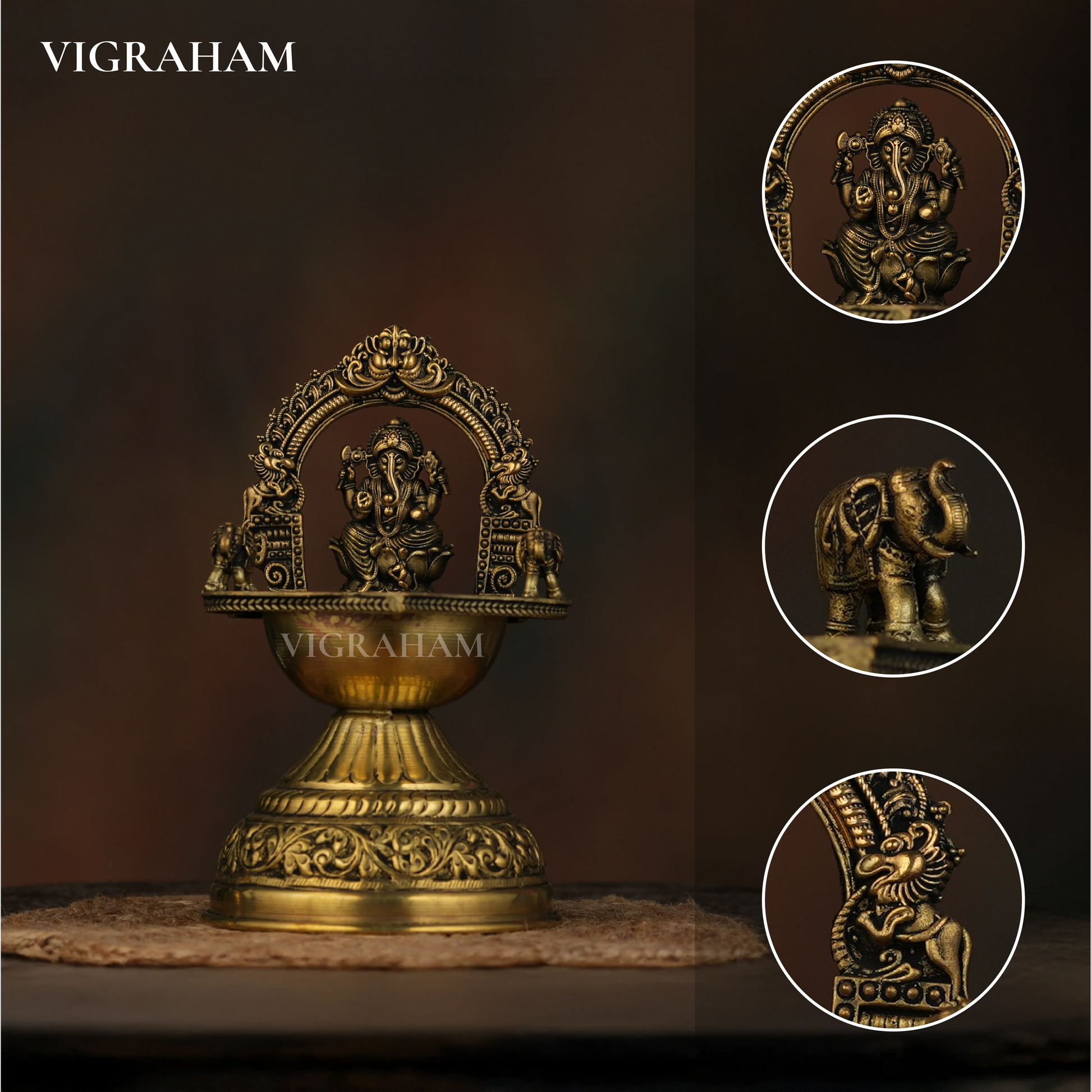 Illuminate your home with divine grace using this handcrafted Ganesh Diya Lamp. Made from premium brass, it features Lord Ganesha seated under an ornate arch, symbolizing wisdom and prosperity. Perfect for pooja rooms, festive décor, or gifting, this 15cm diya blends tradition with timeless artistry.